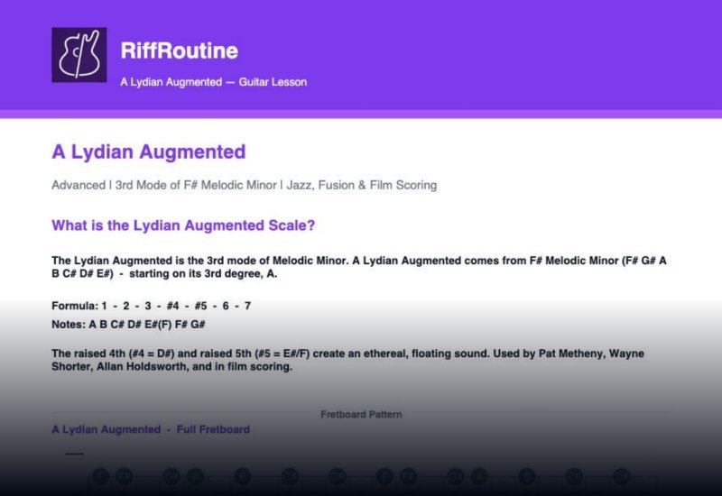 Master the A Lydian Augmented scale — positions, patterns, and practice exercises for guitar.